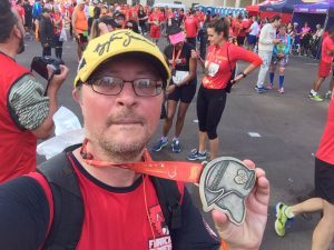 Quando estava me aproximando da última curva me assustei com uma pessoa que atravessou na minha frente sem olhar. Naquele momento a minha única reação foi gritar saaaaaiiiiii. Ufa, consegui desviar e seguir em frente rumo ao final da prova. Percebi que tinha uma corredora na minha frente e usei como referência para a minha arrancada e cruzar a linha de chegada antes dela.